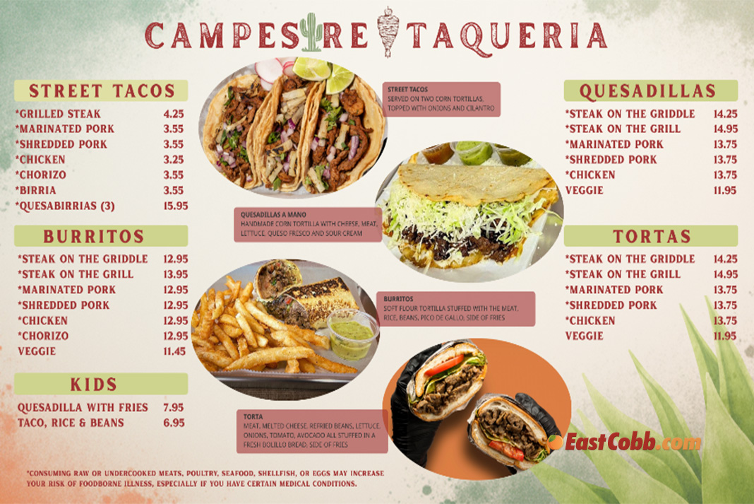 Campestre Taqueria brings the flavors of Mexico to East Cobb, offering homestyle tacos, burritos, and quesadillas made with traditional techniques and simple, authentic ingredients. The word campestre translates to “countryside,” and the restaurant captures that essence through food that feels fresh and full of flavor.